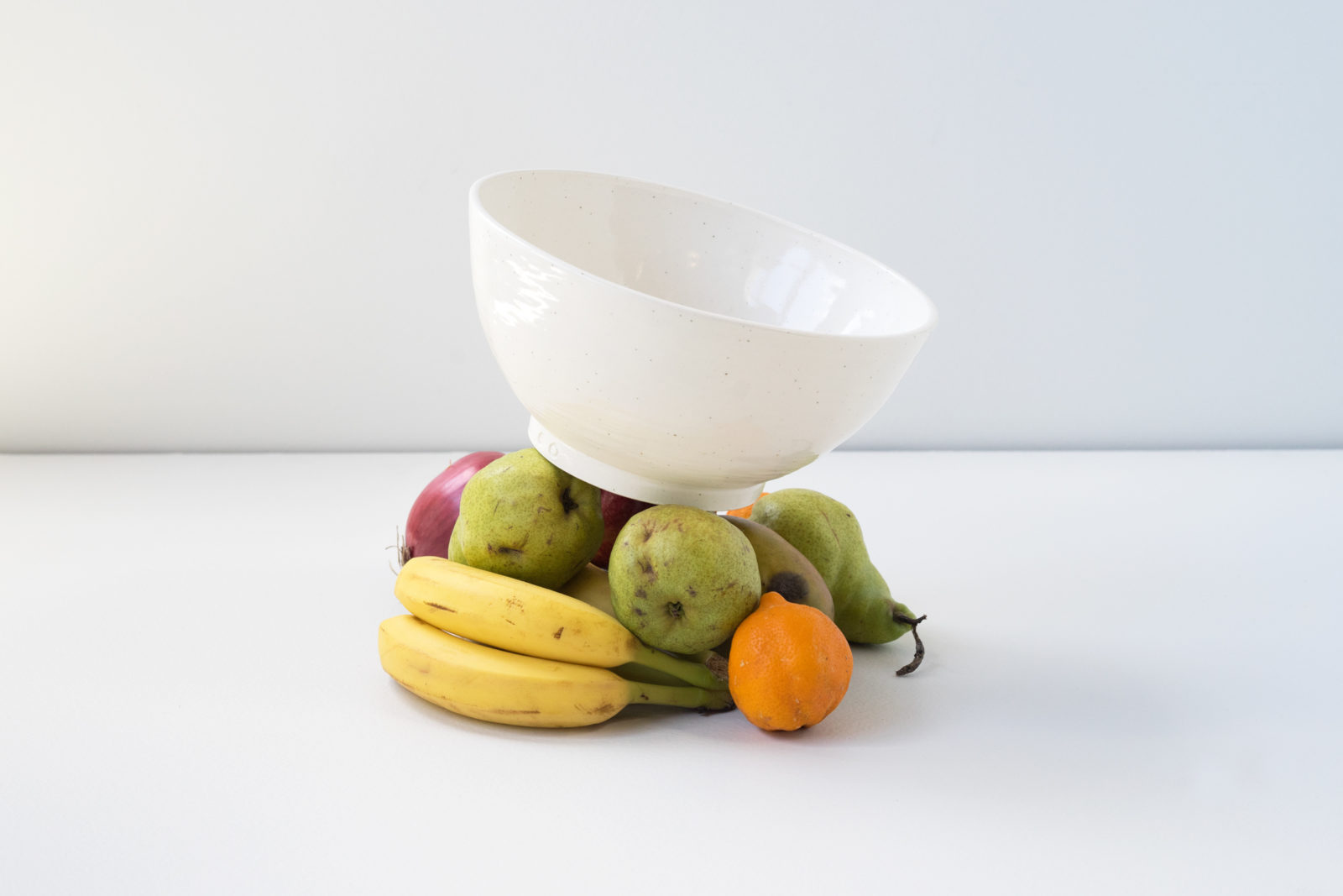 Large white textured fruit bowl, sitting on small pile of fruit.