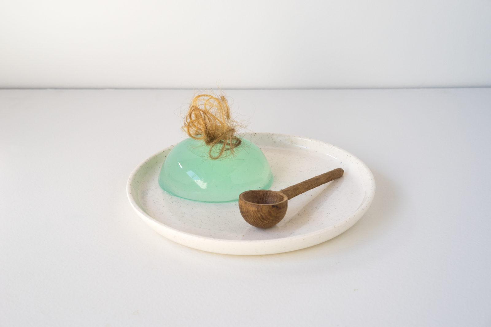 White plate with black sand, jelly, hair clippings & small hand carved spoon.