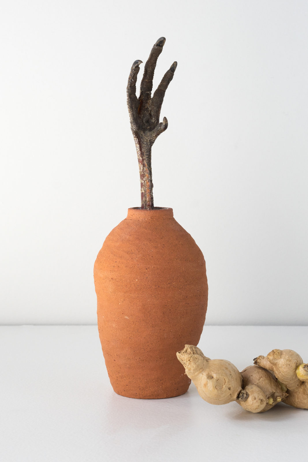 Old mate Turkey sam's foot sitting in natural textured vase, with a side of ginger.