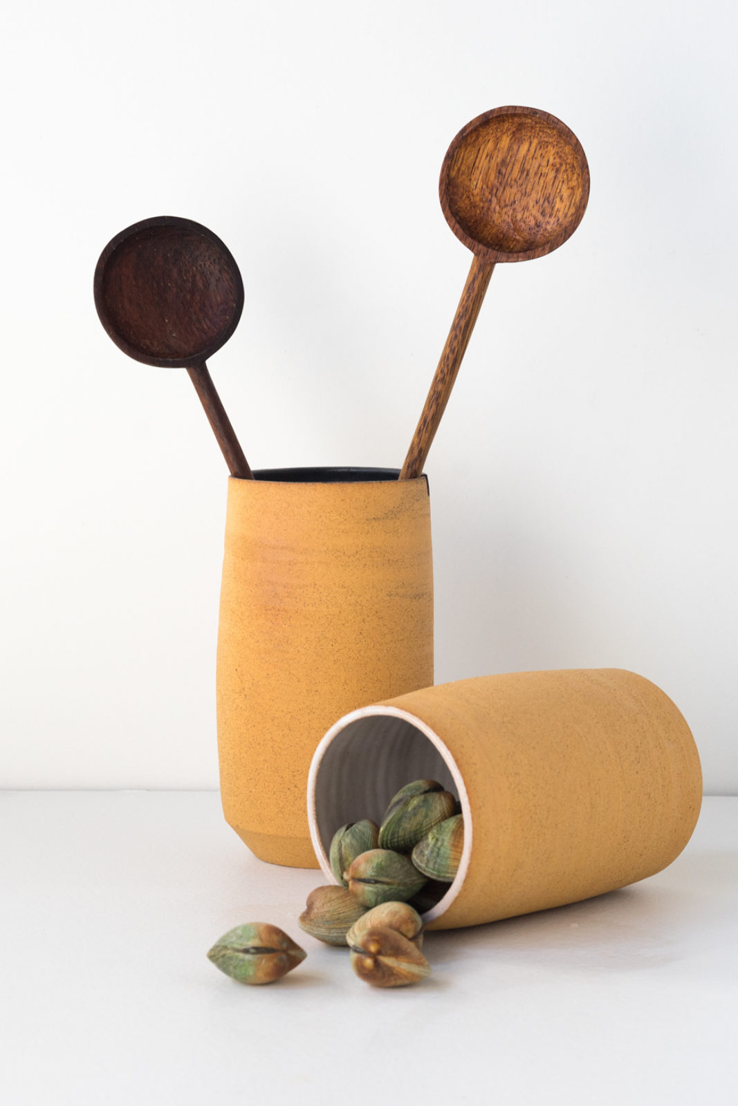 Tuangi and spoons sitting in stoneware containers. Black and white internal glaze available.